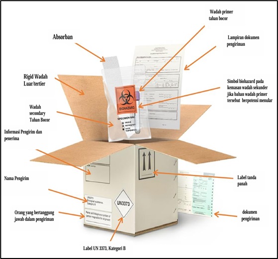 - Kardus diberi label yang jelas dengan simbol biohazard dan informasi tentang isi dan tujuan pengiriman.